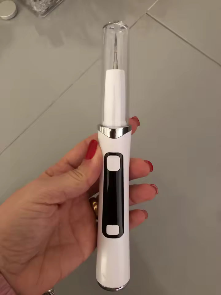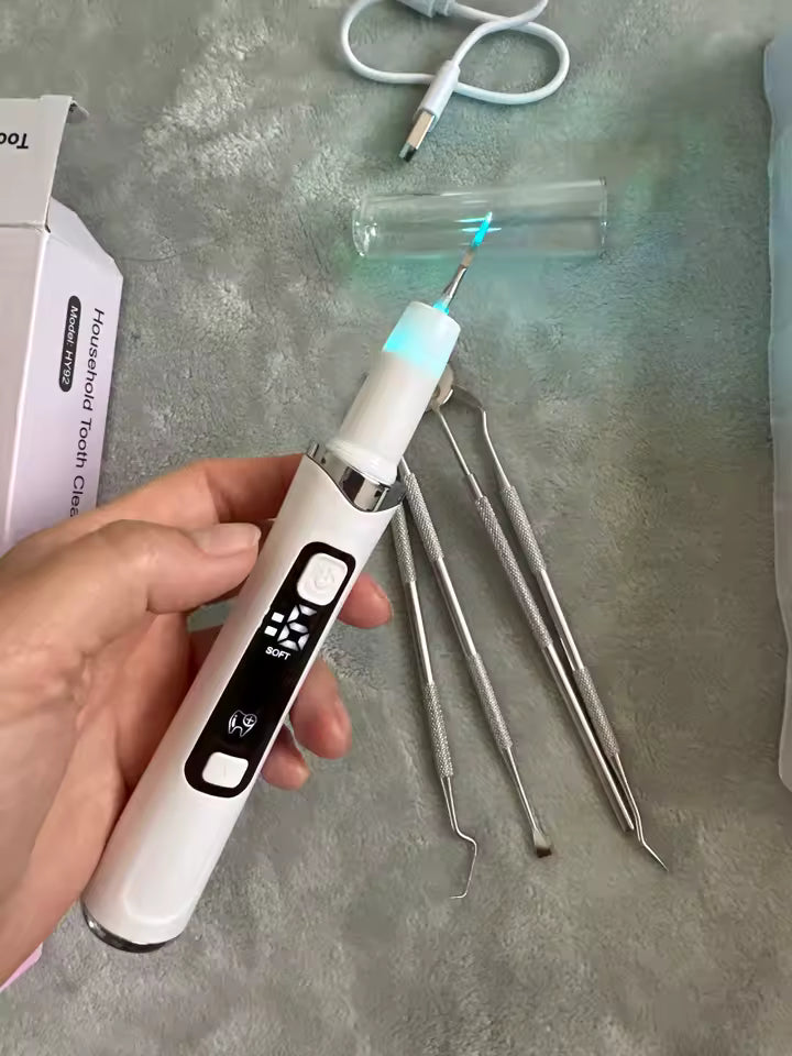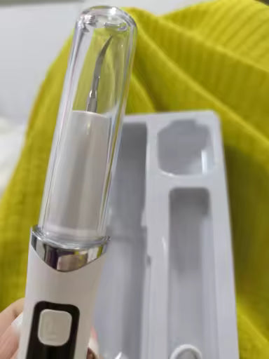 Turn it on, choose a low intensity, and gently rest the tip on the tartar — don’t press. Sweep along the gumline and between teeth, letting the vibration loosen buildup. Rinse the head after you’re done and you’re good.